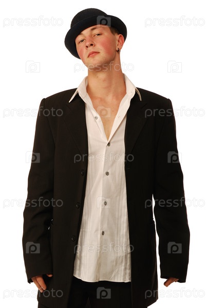 Молодой человек в черном костюме,шляпе и белой рубашке на белом фоне