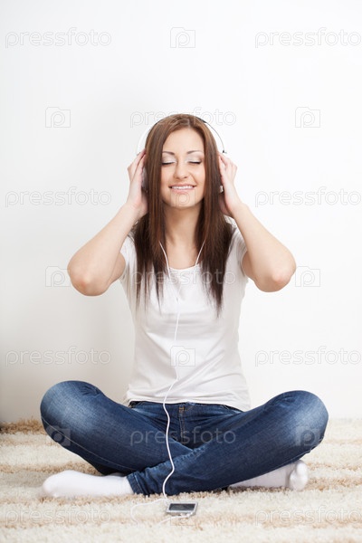 Женщина сидит на диване и слушает музыку