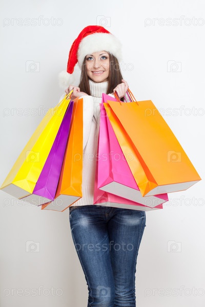 Женщина в новогодней шляпе с пакетами