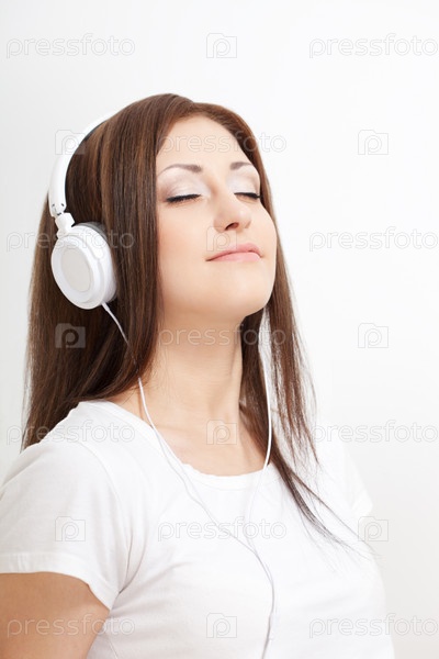 Улыбающаяся женщина слушает музыку