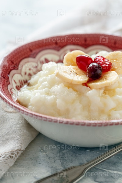 Чаша с молочной рисовой каши с бананами, ягодами и медом