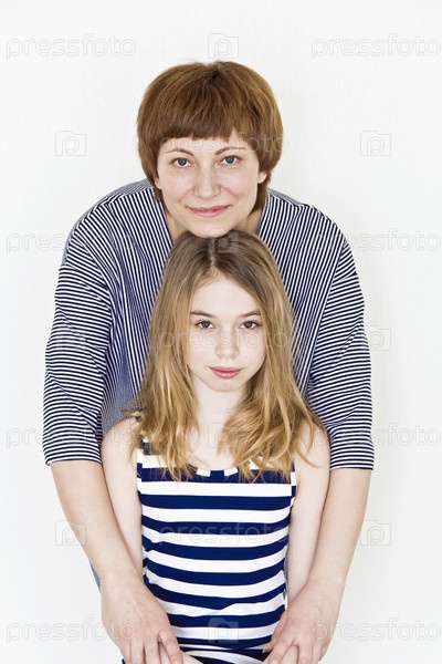 Красивая мать и дочь на белом фоне