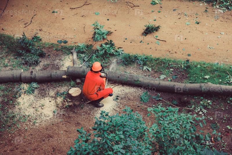 Работник в форме распиливает поваленное дерево