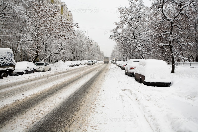 Дорога и припаркованные автомобили покрыты снегом
