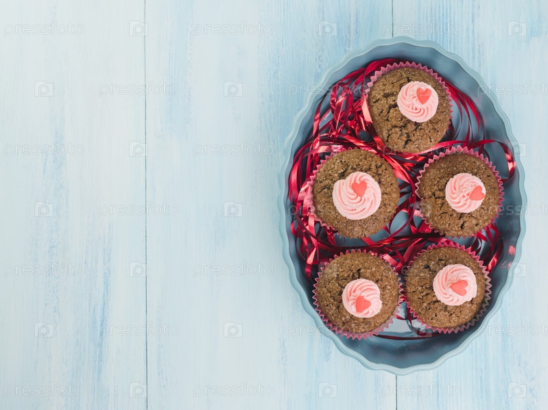 Свежие кексы, украшенный сливками и лентой