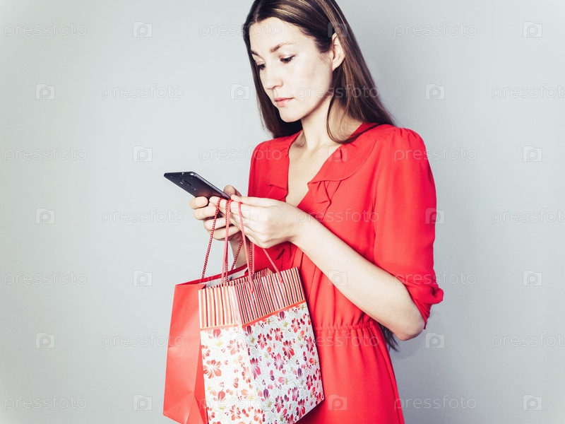 Счастливая женщина в красном платье с телефоном