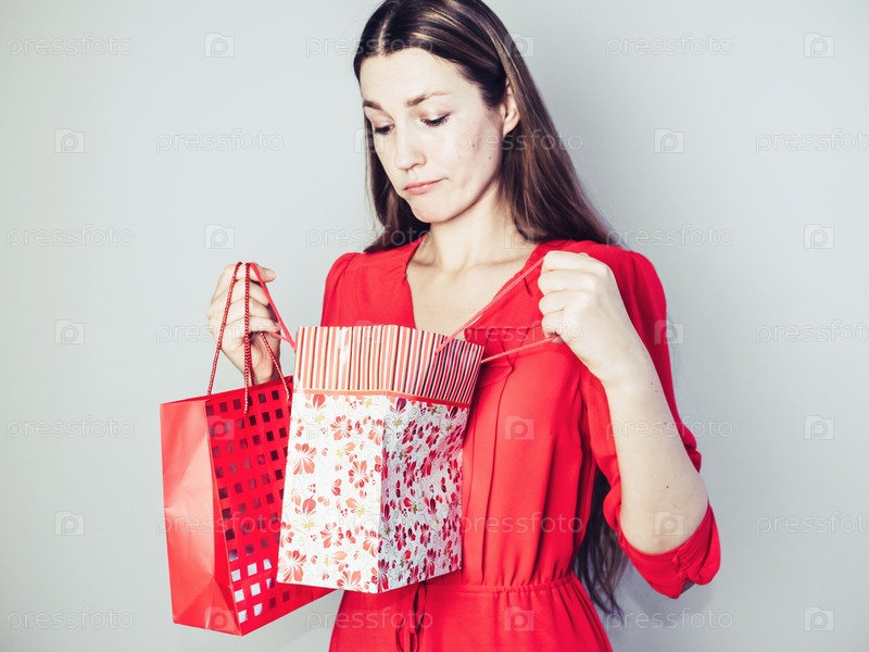 Счастливая женщина в красном платье с покупками
