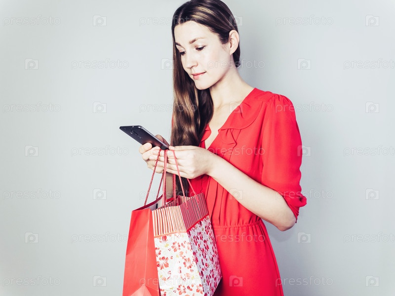 Счастливая женщина в красном платье с телефоном