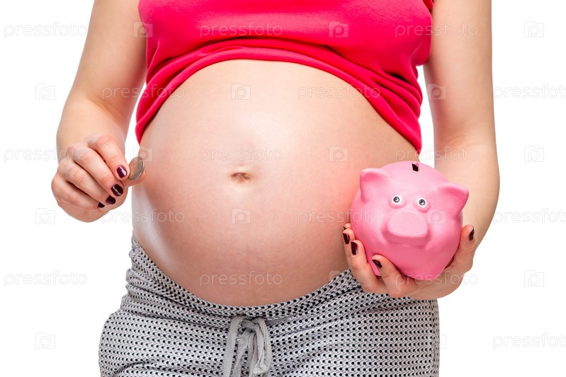 Живот беременной женщины и розовая копилка