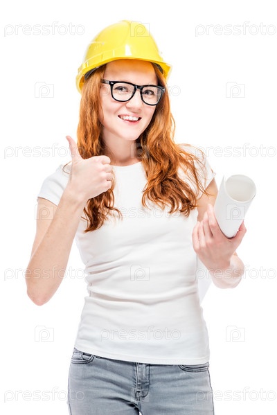 Портрет женщины в желтом шлеме с чертежами на белом фоне