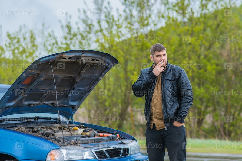 Встревоженный водитель пытается починить машину