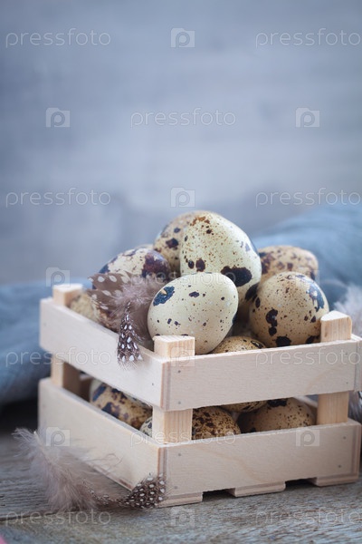 Перепелиные яйца в деревянной коробке с перьями