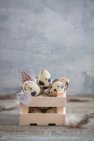 Перепелиные яйца в деревянной коробке с перьями