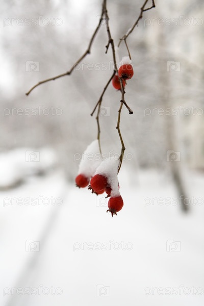 Красные ягоды боярышника покрыты снегом