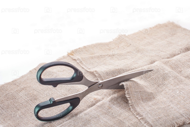 Ножницы портного режут льняную ткань
