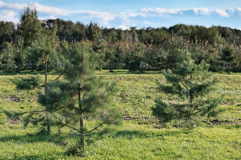 Молодые сосны на фоне зеленой травы