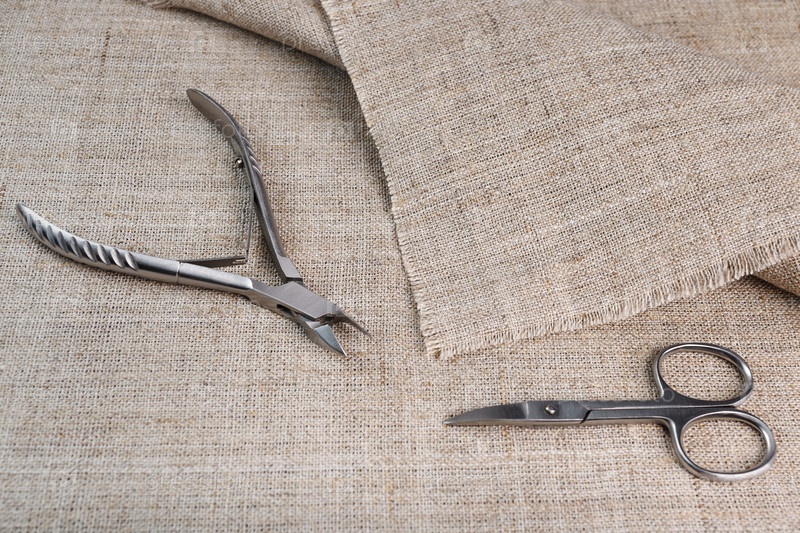 Маникюрные инструменты и кусачки на фоне льняной ткани