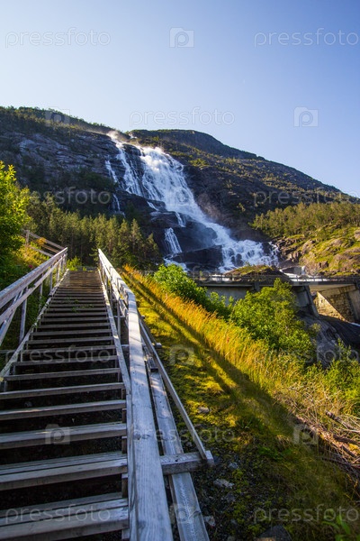 Летний горный водопад Лангфоссен на склоне Этны, Норвегия