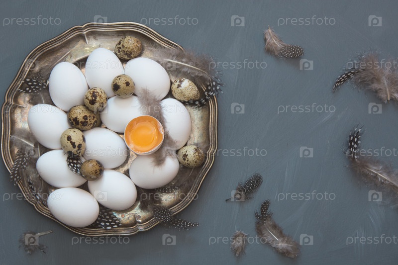 Белые куриные и перепелиные яйца в винтажной тарелке