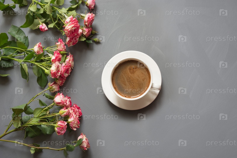Букет из розовых кустов роз и чашка кофе зрения