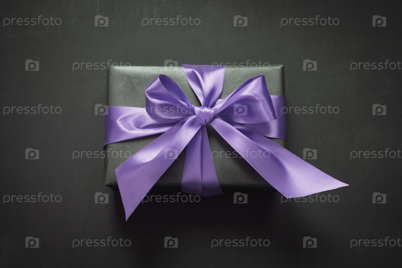 Подарочная коробка в черной бумаге с фиолетовой лентой