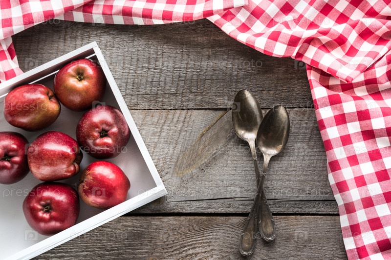 Спелые красные яблоки в березовой коробке на деревянной доске
