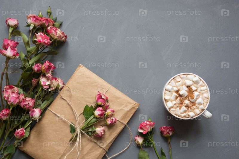 Букет из розовых кустов роз, подарок и чашка кофе