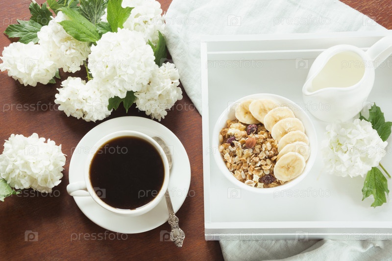 Здоровый завтрак с чашкой кофе, мюсли, бананами с цветами сирени