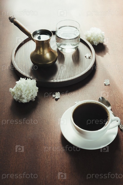 Чашка черного кофе в медной турке и стакан воды