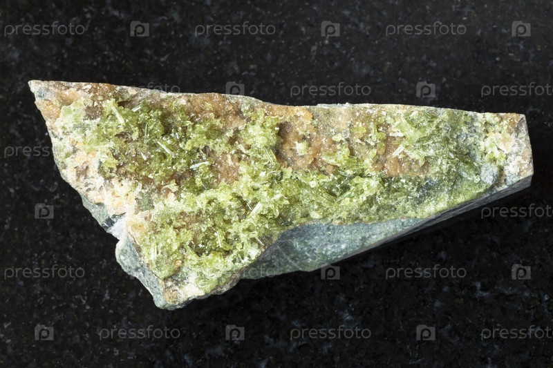 Зеленые кристаллы везувиана на необработанном камне на темном