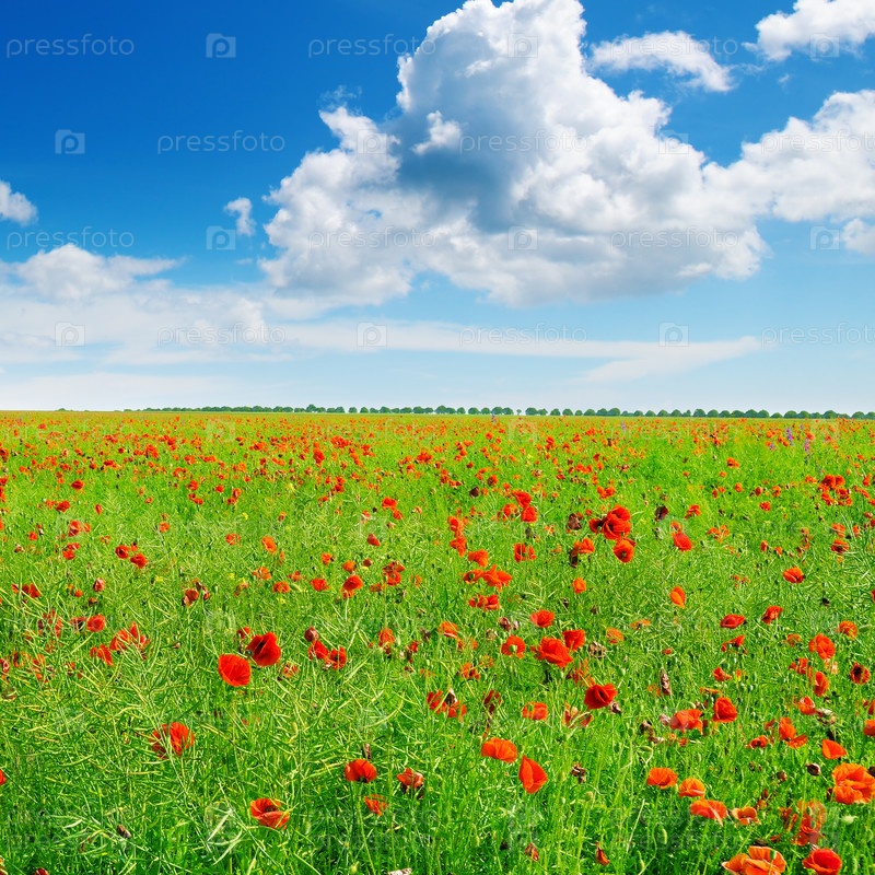 Луг с дикими маками и голубым небом