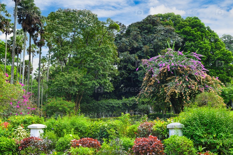 Великолепный тропический парк с красивыми деревьями и цветами