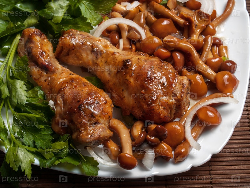 Куриная голень, запеченная в духовке с солеными грибами и зеленью