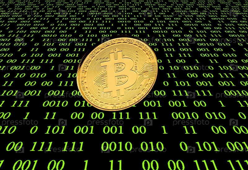 Золотая монета биткоин на фоне матрицы