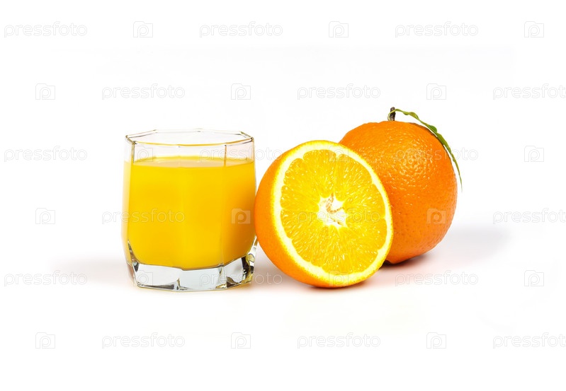 Стакан апельсинового сока и апельсин на белом фоне