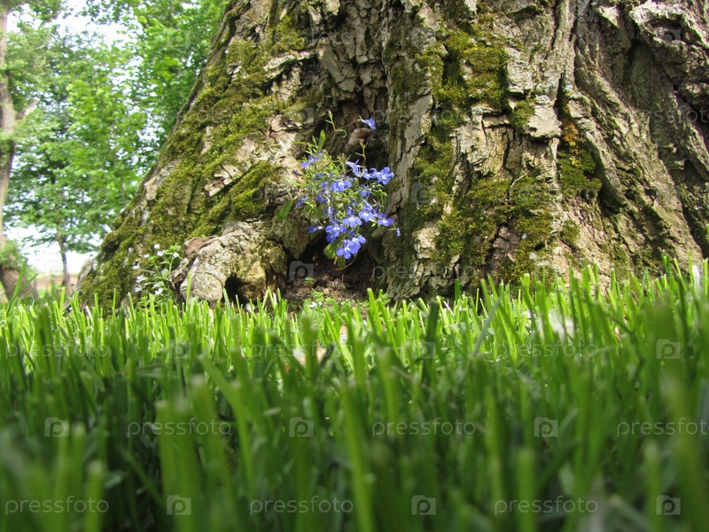Газон и синие цветы на коре