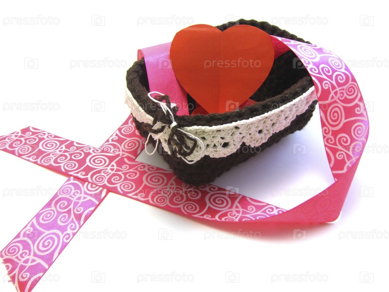 Красное сердце в корзине с розовой лентой на белом фоне