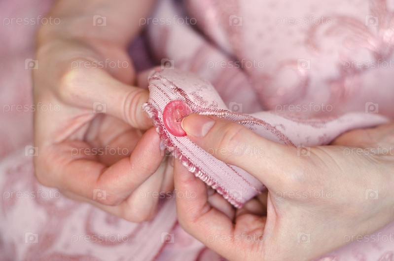 Руки молодой девушки пришивают пуговицу