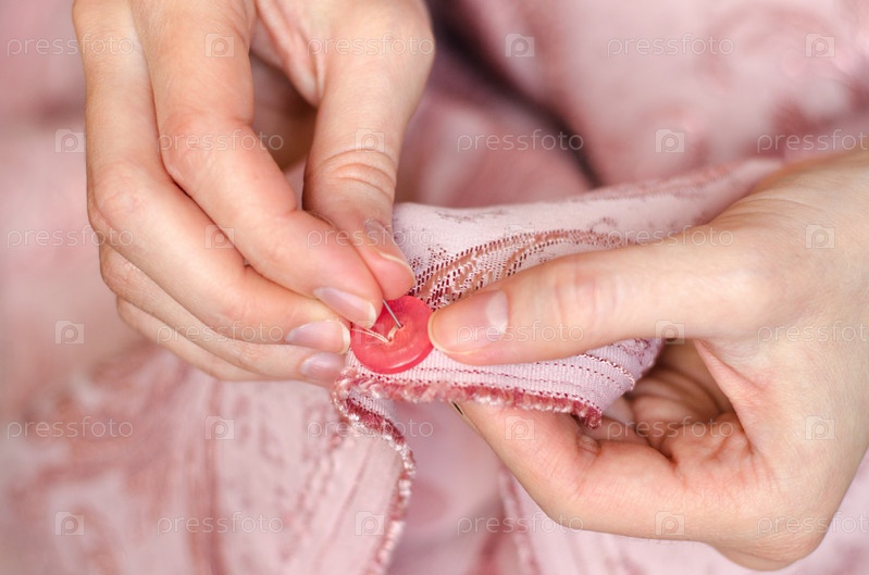 Руки молодой девушки пришивают пуговицу