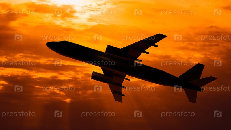 Силуэт летящего самолета на фоне заката
