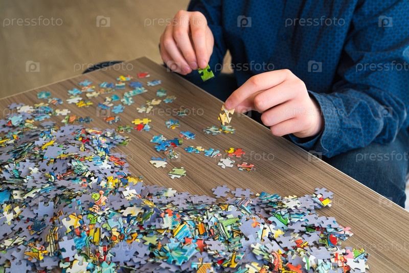 Подросток собирает головоломки на журнальном столике
