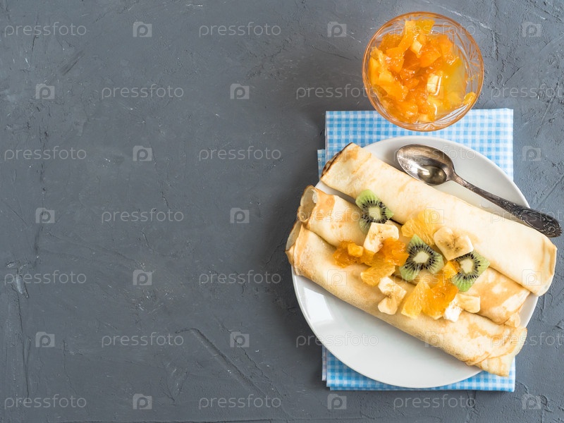 Вкусные блины, украшенные кусочками банана, киви и апельсина