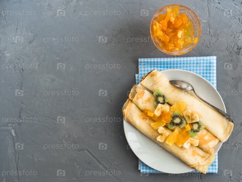 Вкусные блины, украшенные кусочками банана, киви и апельсина