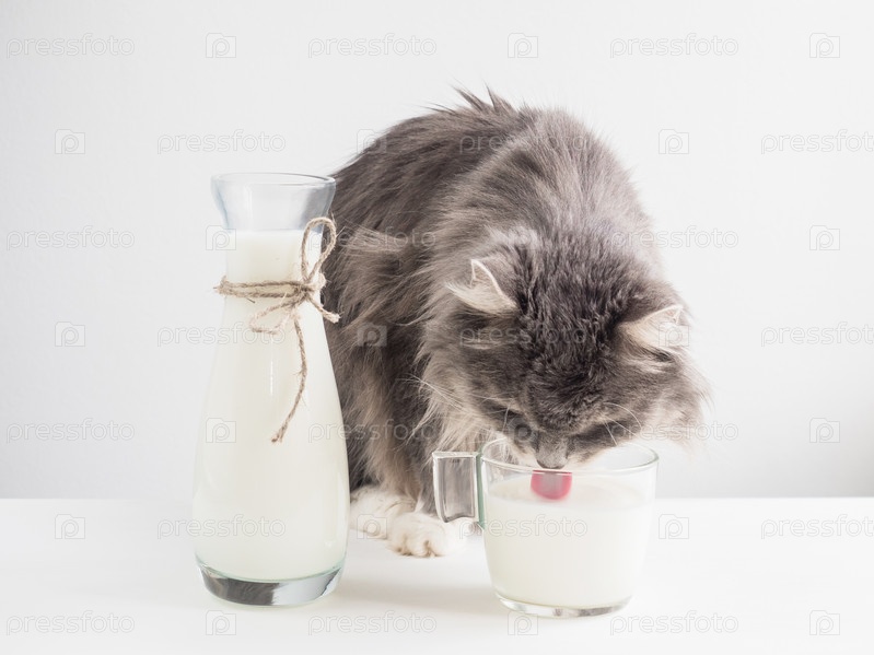 Симпатичный серый кот пьет свежее молоко из стеклянного стакана