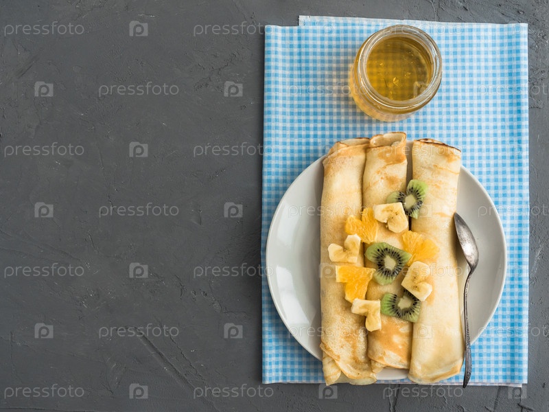 Вкусные блины, украшенные кусочками банана, киви и апельсина