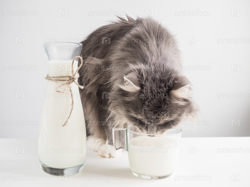 Симпатичный серый кот пьет свежее молоко из стеклянного стакана