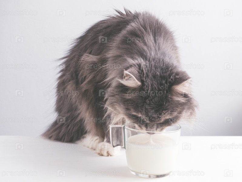 Симпатичный серый кот пьет свежее молоко из стеклянного стакана