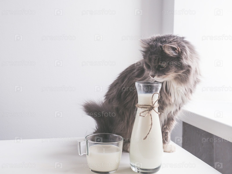 Симпатичный серый кот пьет свежее молоко из стеклянного стакана