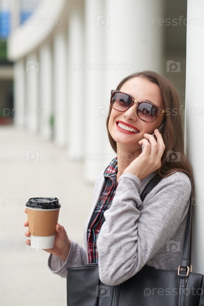 Веселая женщина говорит по телефону