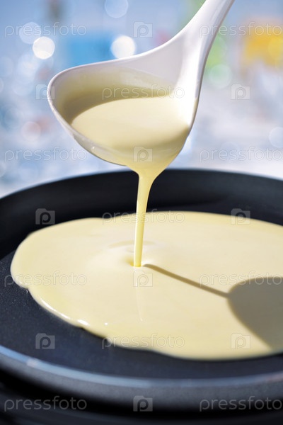 сковорода Блинчики делают тесто праздничным потоком ложкой